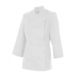 Descripción: Chaqueta de cocinero de manga larga con cuello tirilla. Doble botonadura con automáticos. Un bolsillo de parche en la manga izquierda.
