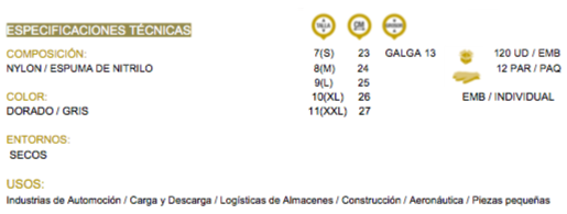 Descripción: Guante de nitrilo de cinco dedos de nylon 100%, galga 13, recubierto de nitrilo en palma y uñeros. Puño elástico de ajuste.