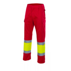 Descripción: Pantalón bicolor de alta visibilidad con dos cintas reflectantes en las piernas y banda flúor entre ellas. Con pinzas, elástico en la cintura y seis bolsillos, cuatro de ellos con tapetas y cierre con velcro.